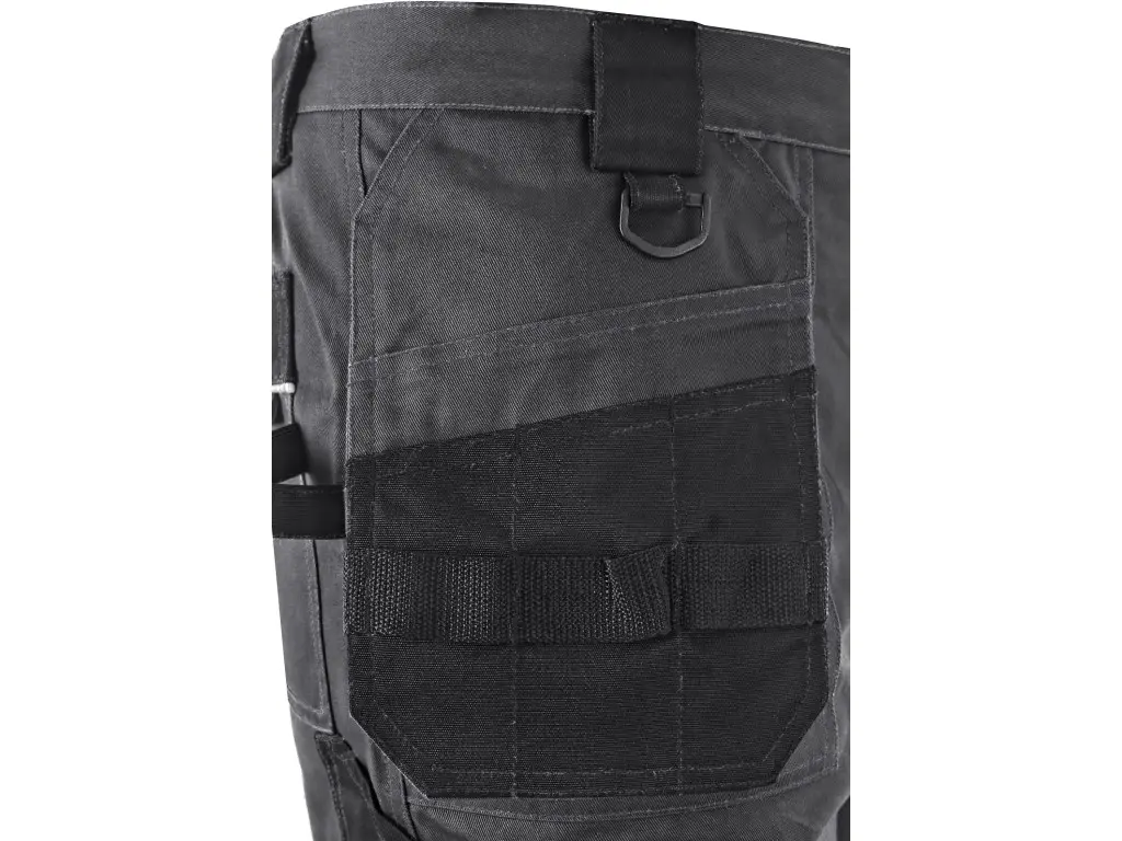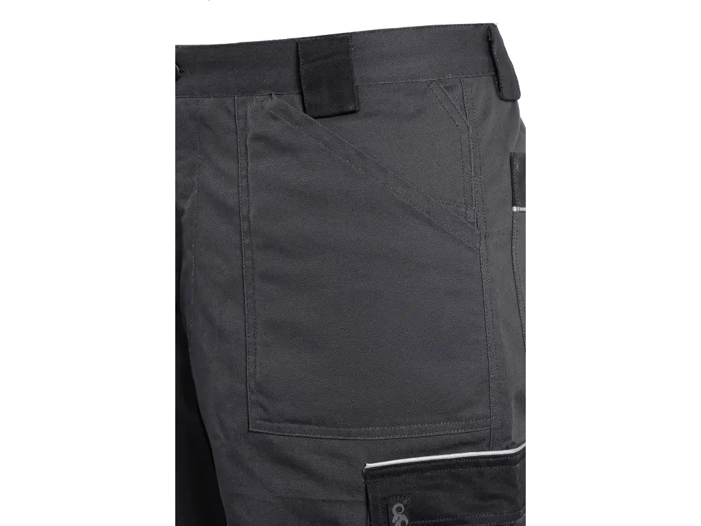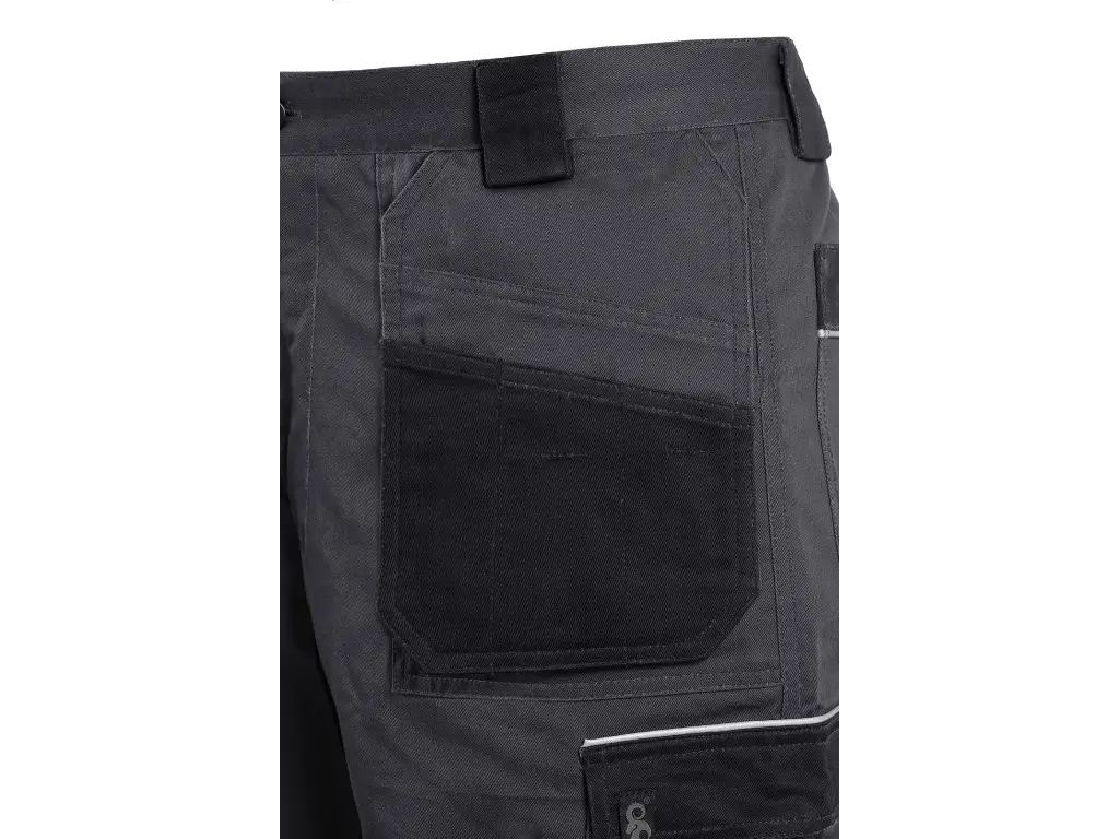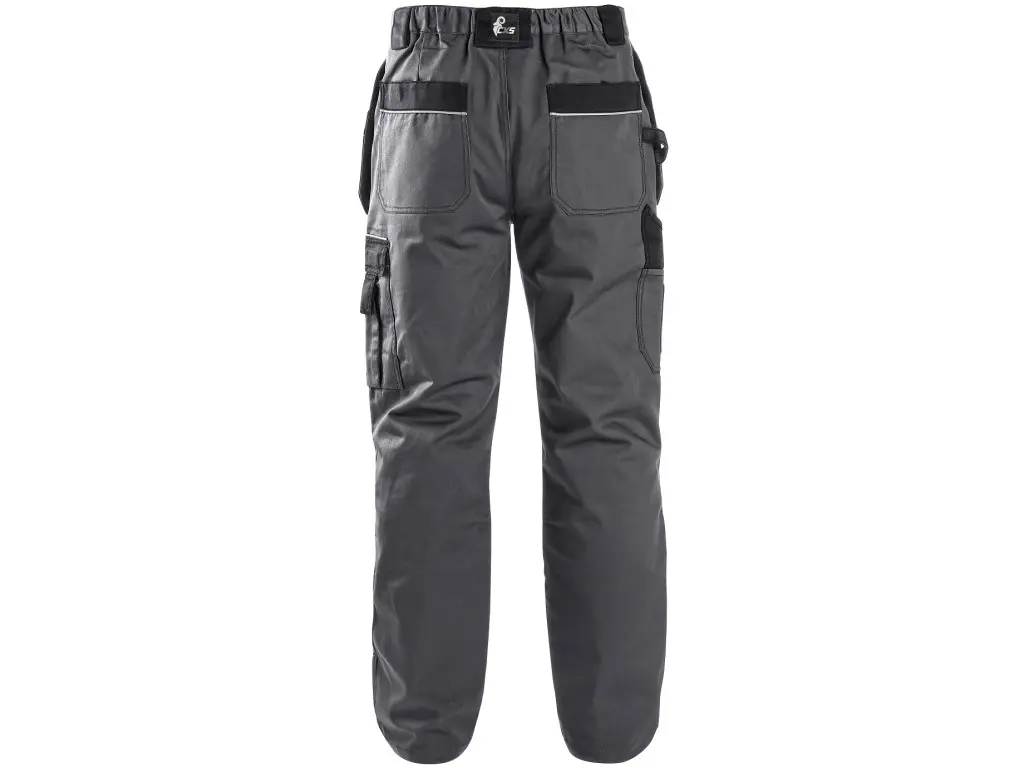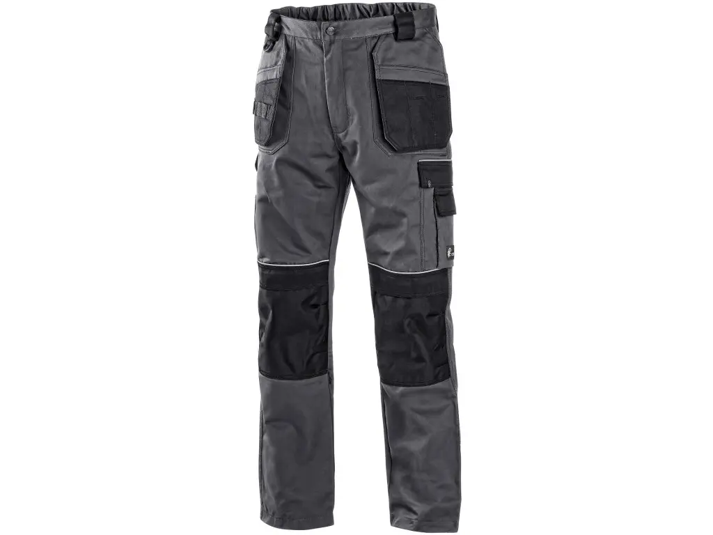 Pánske montérkové nohavice, pás s pútkami na opasok, vzadu do gumy, predné voľne visiace vrecká na náradie s možnosťou vloženia